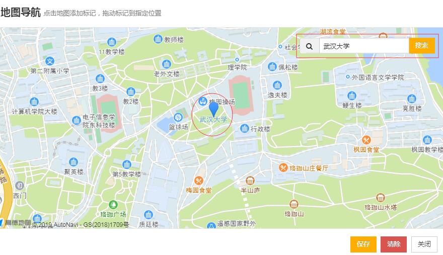 然后点击“添加地图导航”功能,网页弹出地图,在搜索框中输入想要标注的地址,然后在地图上面点击出现如下图所示蓝色图标,然后保存即可。